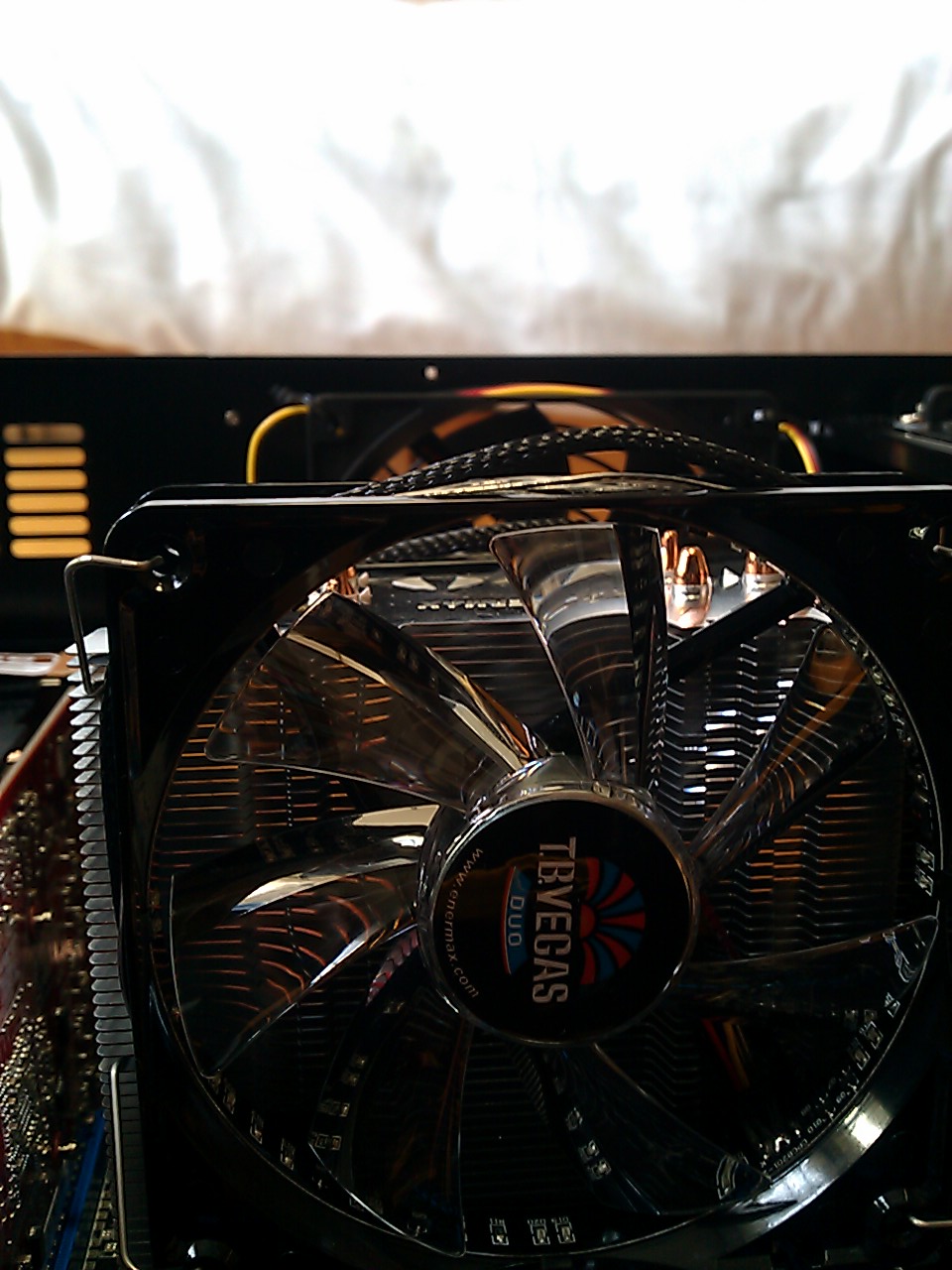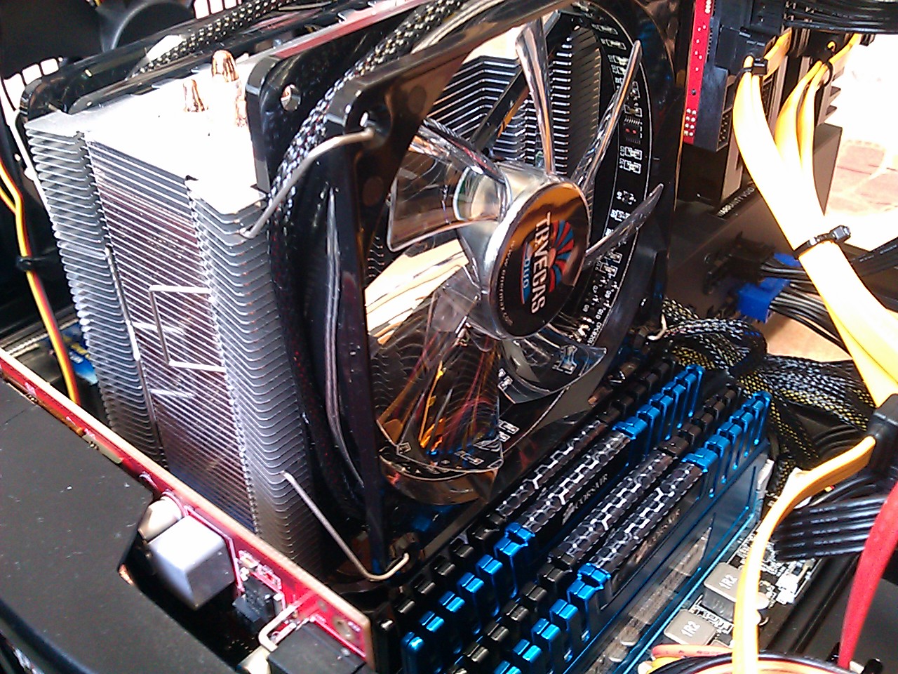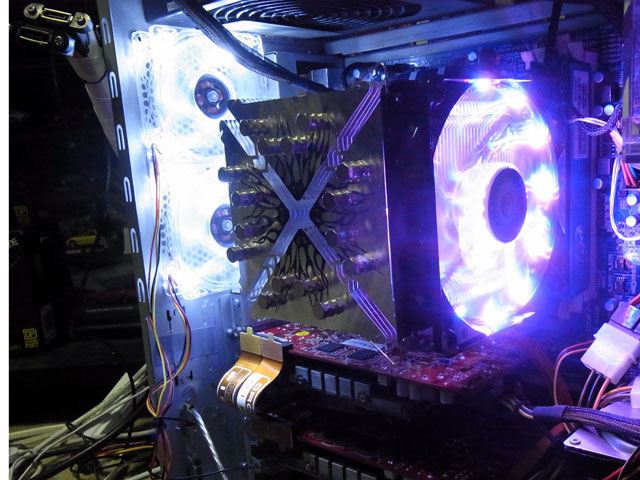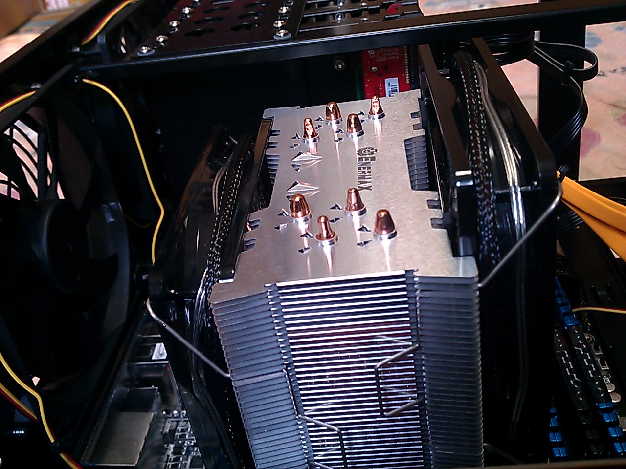忍者3も以前はこの方法でVGA冷却を行っていたのだが、マザーの変更でCPU位置がVGA寄りになり、ファンをVGA側につけるどころかクーラー自体がVGAと接触寸前に。しかしETS-T40ならこの通り現在のZ68 pro3-Mでも上下方向に配置できた。