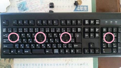 次に、このピンクの場所のキートップを外すとネジが(4カ所)出てきます。これも外して下さい。それでようやく中身を見ることが出来ます。