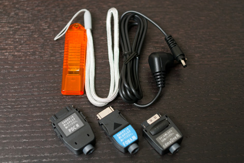 写真に写っているのは、ホイッスルやストラップにケーブル、そして各社の携帯電話に接続する為のアダプターになります。(オレンジ色のがホイッスルです。さすが、防災用!)