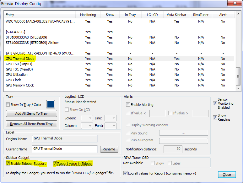 Sensors → Configure で、