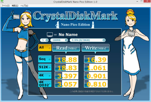 Class 10ということで10MB/s以上の転送速度が保証されているわけですが、実際に測ってみるとリード18MB/s、ライトが16MB/sほど出ているのでだいぶ余裕がある速度でした。