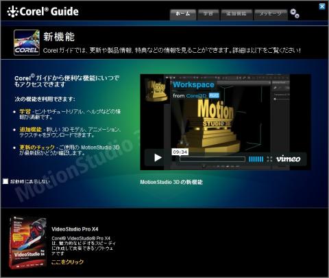MotionStudio 3Dは、1,000種類以上の多彩なテンプレートを持つ3Dタイトル/オブジェクトアニメーションソフトウェアです。3DCGの汎用フォーマットである3ds形式に対応し、3Dオブジェクトの作成がはじめての人も安心して作業することが可能です。また、ビデオ編集ソフト VideoStudioと連携することで、映画のような3Dタイトルやアニメーションを付加したホームムービーが完成します。(Corel様サイトより引用)