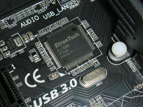 この頃のチップセットはUSB3.0は統合されておらず、外付けのEtronTechのEJ168A(USB3.0を2ポートサポート)が、2つ載っており合計4ポートサポートします。ただ、このチップは割と相性問題が出やすいです。ECSの廉価マザーでさえ、ルネサスチップを積んでいるのに・・・