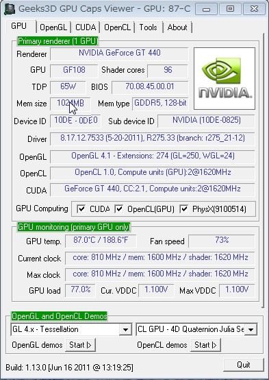 GREEKS3D GPU CAPS VIEWER でGPU温度を見ると98度とかなってますやん.....