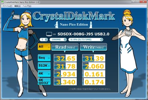 【USB2.0ポート接続】Sequential系はClass4に比べてRead:20.10MB/秒⇒32.65MB/秒、Write:13.59MB/秒⇒31.39MB/秒とともに公称転送速度(30MB/秒)を上回り、倍ほど伸びを見せた。逆に