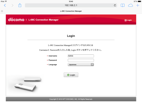 192.168.2.1 を指定し、初期パスワードは1234を入力。