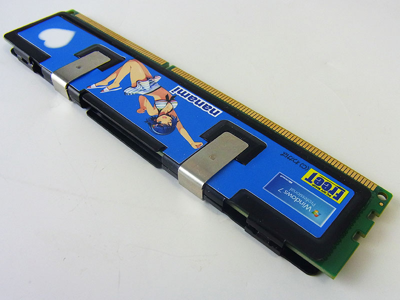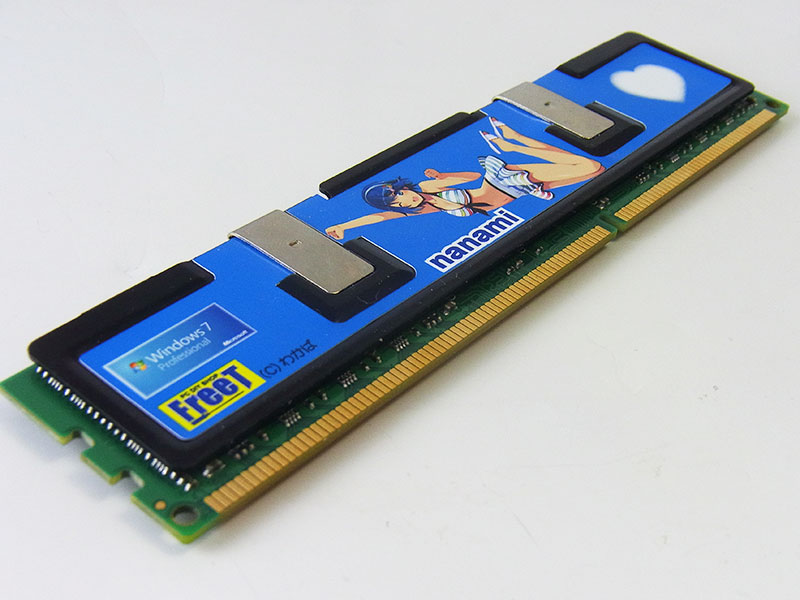 裏表のデザインは同じかと思いきや、片側はWindows7Ultimateの黒いロゴ、もう片側はWindows7Proの青いロゴという小技がきいている。しかし実際にメモリを装着するとかなり隣接した配置になるので、見えるのは片側だろう。