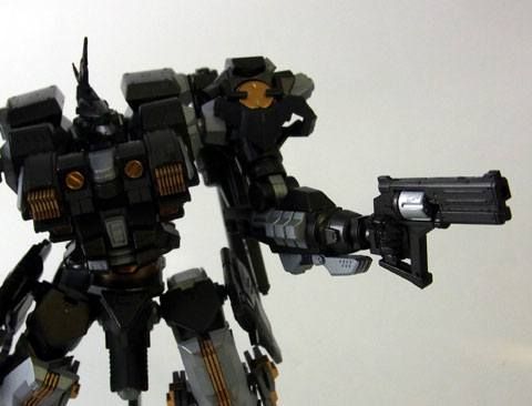 実際この機体をゲーム中で再現すると敵が多いミッションでは弾切れ間違いなし。というわけで別売りの武装セットを買い足し左肩の長距離実弾スナイパーキャノンと右腕のハンドガンをくっつけてみた。
