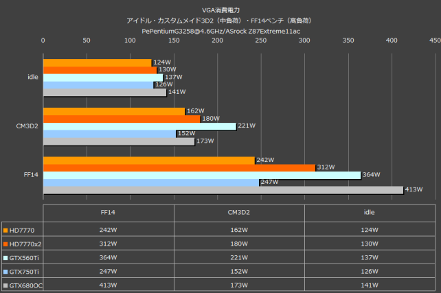 但し60FPSに到達した時点でそれ以上の負荷がかからなくなるカスタムメイド3D2では、GTX680以上の消費電力を叩き出してしまい突出して高い。やはり世代の古さか。