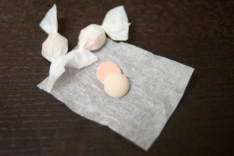 紙の包みを開けると、赤と白の可愛らしい干菓子が2つ。