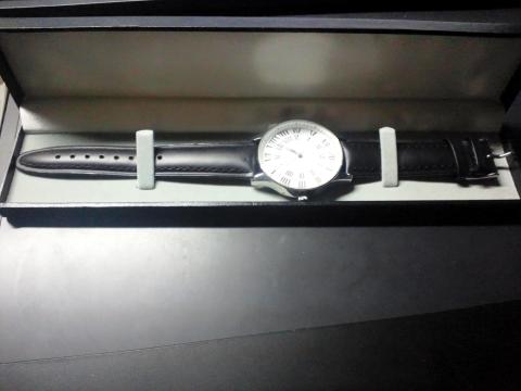 中には時計が入っています。黒革のバンドに白い文字盤の時計です。