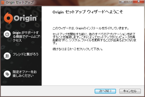ダウンロードした”OriginSetup.exe”を起動してOriginをセットアップします。