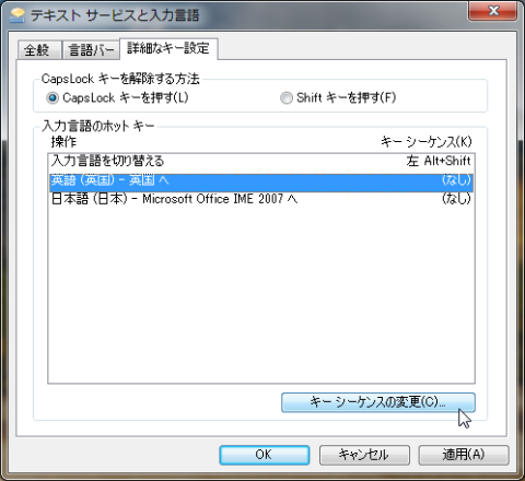 「詳細なキー設定」タブを開いて「英語(米国) - 英国へ」を選択して「キーシーケンスの変更」を選択。