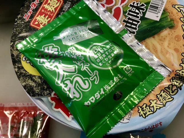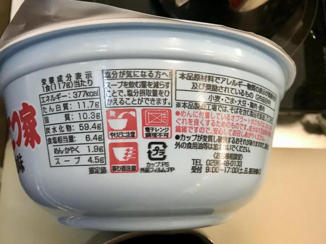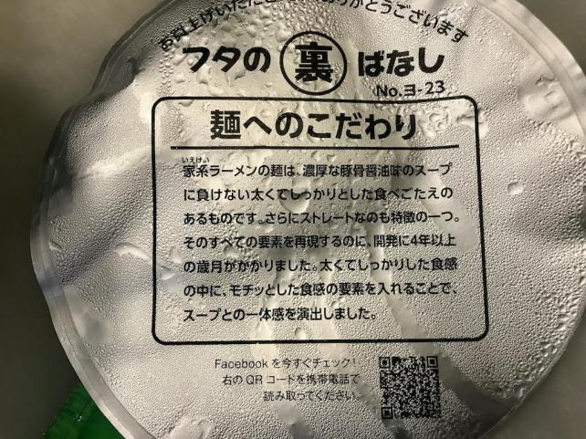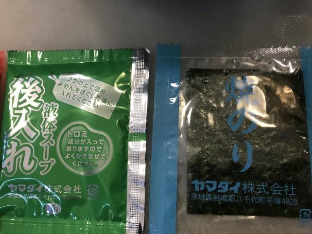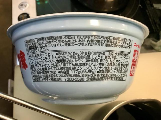 - 原材料:めん(小麦粉、食塩、大豆食物繊維)、スープ(しょうゆ、動物油脂、ポークエキス、食塩、チキンエキス、糖類、ニンニクペースト、蛋白加水分解物、調味油脂、醸造酢、ショウガペースト、でんぷん)、かやく(味付豚肉、焼のり、ネギ、ホウレンソウ、糖類、ゼラチン)、加工でんぷん、調味料(アミノ酸等)、酒精、増粘剤(加工でんぷん、タマリンドガム)、かんすい、カラメル色素、香料、酸化防止剤(ビタミンE)、クチナシ色素、(原材料の一部に卵、乳成分、ごまを含む)