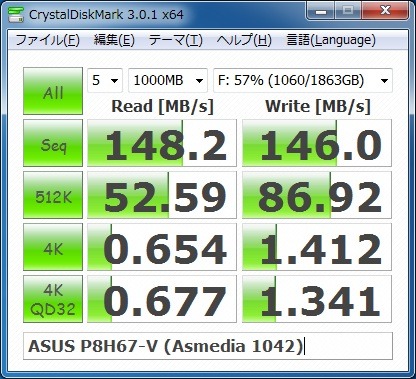 ・ASUS P8H68-VのオンボードUSB3.0(Asmedia 1042)の場合は、ほぼ同じ速度が出ています。