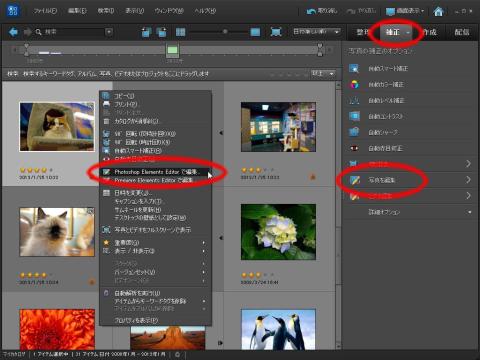 この画面から画像を編集するには選択した画像の上で右クリックで出るメニューから「Photoshop Elements Editorで編集」を選択します。