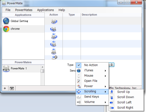 PowerMatesペインで設定したいPowerMateを選択して、アクションに対して実行する内容を割り当てます。
