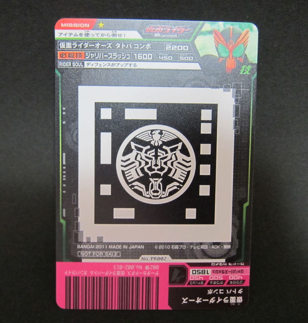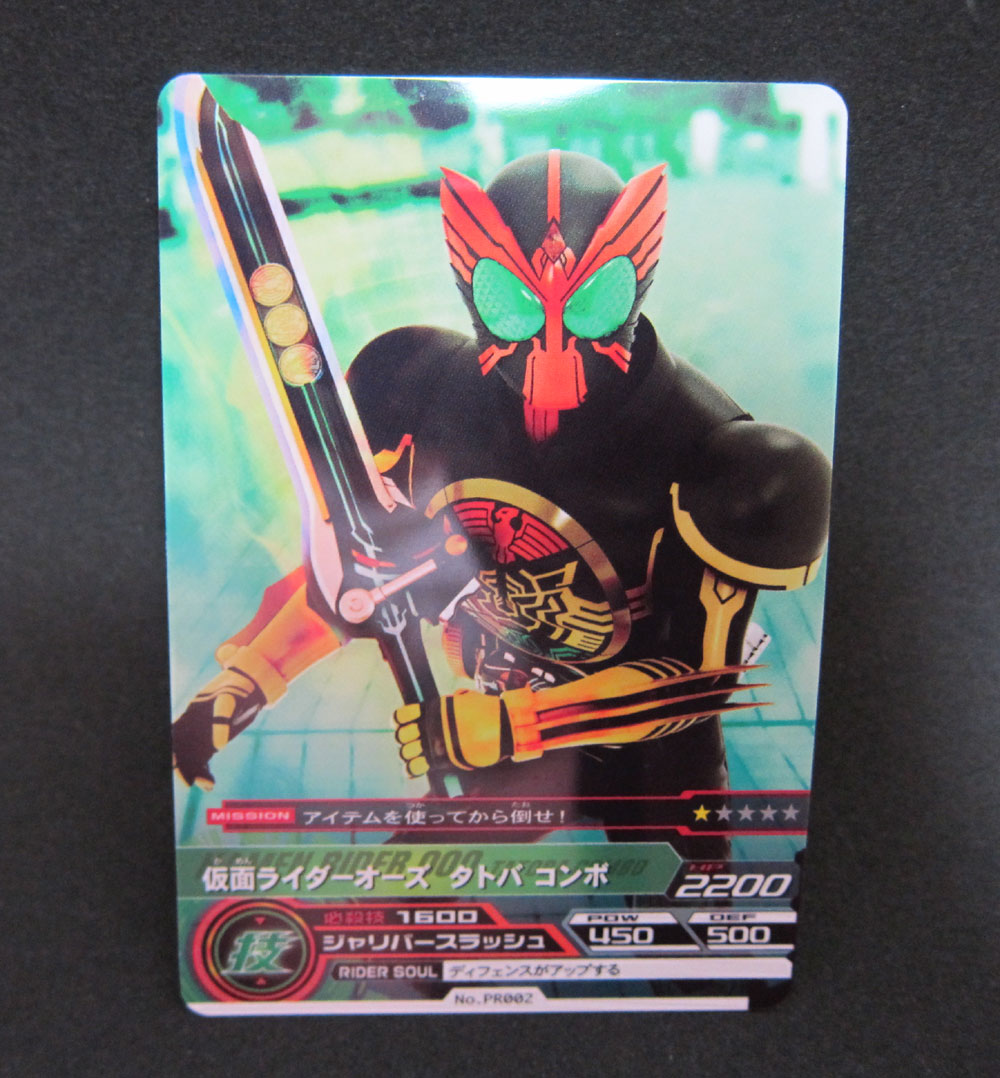3枚をDXオーズドライバーに挿入し読み込ませるとブラカワニ・コンボの変身ソングが流れます。
