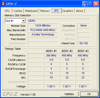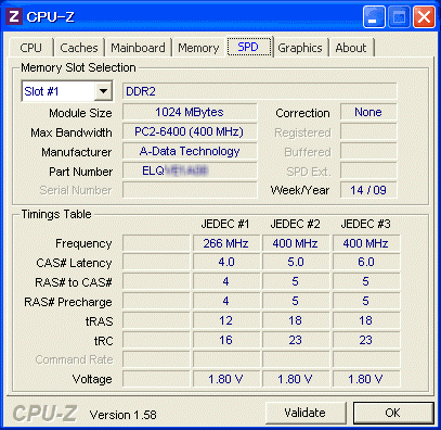 CPU-Zを見るとA-DATA製ですね、ひとつは2009年14週製造、もう一つが50週です。