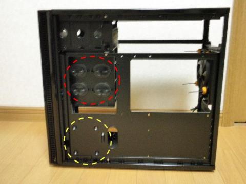 また黄色で囲ったところは、内側から2.5インチドライブを取り付けできます。ただこれが非常に取り付けしにくい。出来れば、HDDにネジを仮止めした状態で、ケースのねじ穴に入れ、スライドさせるような工夫をしてほしいですね。