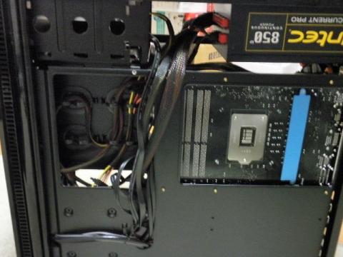 裏面は,前モデルにはCPU周りのサービスホールがありませんでしたが、今回のモデルではかなり大きく開けてあります。このことにより、クーラーの取り付け時に,一々マザーを外す必要がなくなりました。また共振を防ぐため、最小限ではありますが、裏配線用のホールを設けています。
