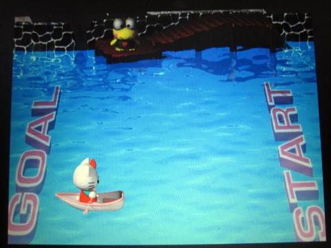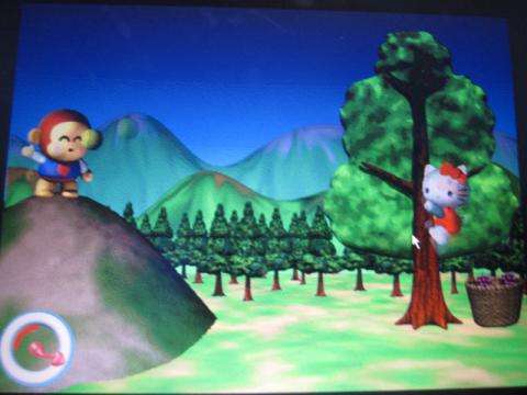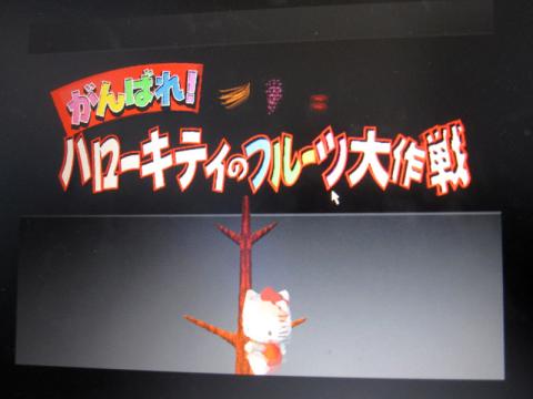 キティちゃんをボートに乗せたがってますね。キティちゃんでできるゲームは、フルーツ捕り。もんきちが投げるボールに当たらないようにして、フルーツを収穫します。