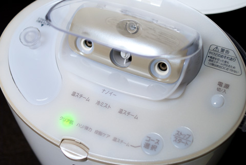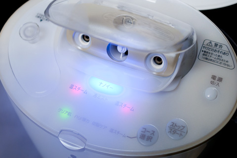 中には、温スチーム吹出口が2つ、冷ミスト吹出口が1つ、それと各種ボタン(コース選択ボタン、ストップ/スタートボタン、電源ボタン)があります。