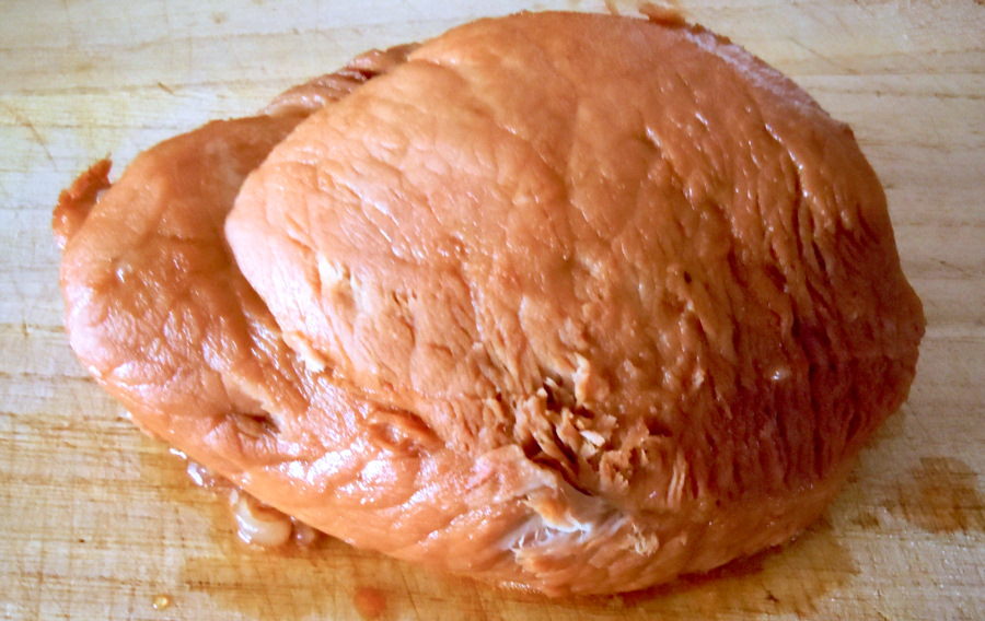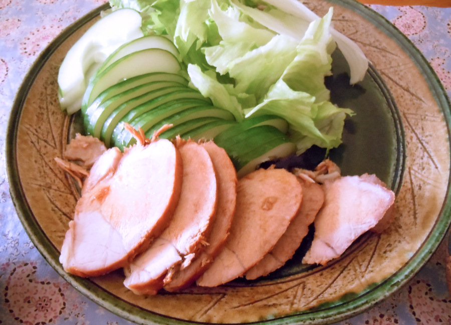 豚もも肉を薄い炭酸水+塩で下ゆで、さらに醤油+すきやばし次郎の米酢+砂糖+塩+マギーブイヨンで煮て味を付けてみました。