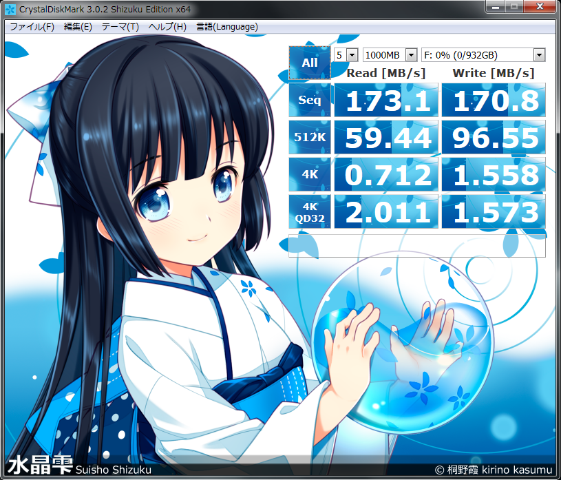 さて、そんなことは置いておいて、とりあえず、せっかく速い製品を買ってみたので、とりあえずフォーマット直後の状態を雫ちゃんに計測してもらいます。