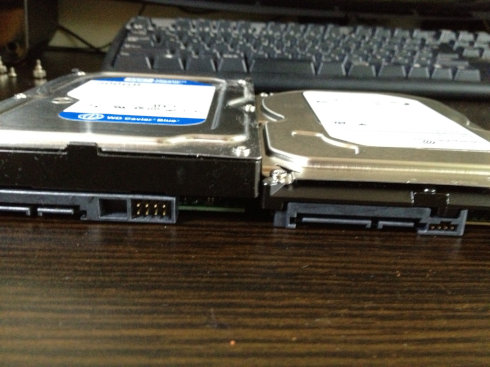 定規で測るとこの製品(右)が約20mm、WD青(左)が25mm。スペックから差はそこまでないように思えますが、右は銀色のプレート部が厚く、それ以外の部分は16mmのため、スペック以上に薄く感じます。まあ、これは先述の1TB×1枚プラッタの効果でしょう。