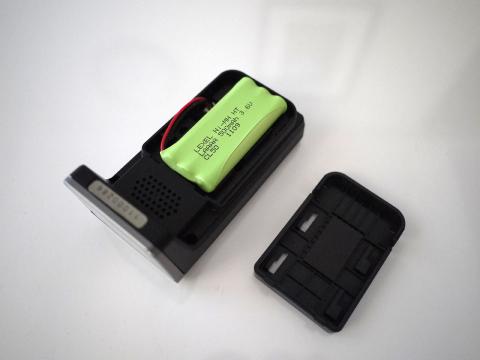 底面の蓋を爪を抑えながら引き上げ、電極にコードを差し込み、充電電池を格納します。