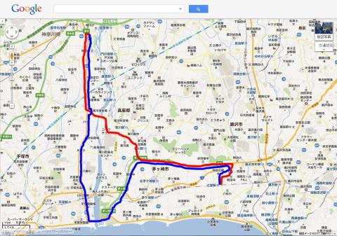辻堂駅前付近がスタート地点で、行きのコースが赤のライン、帰りのコースが青のラインで記述してあります。