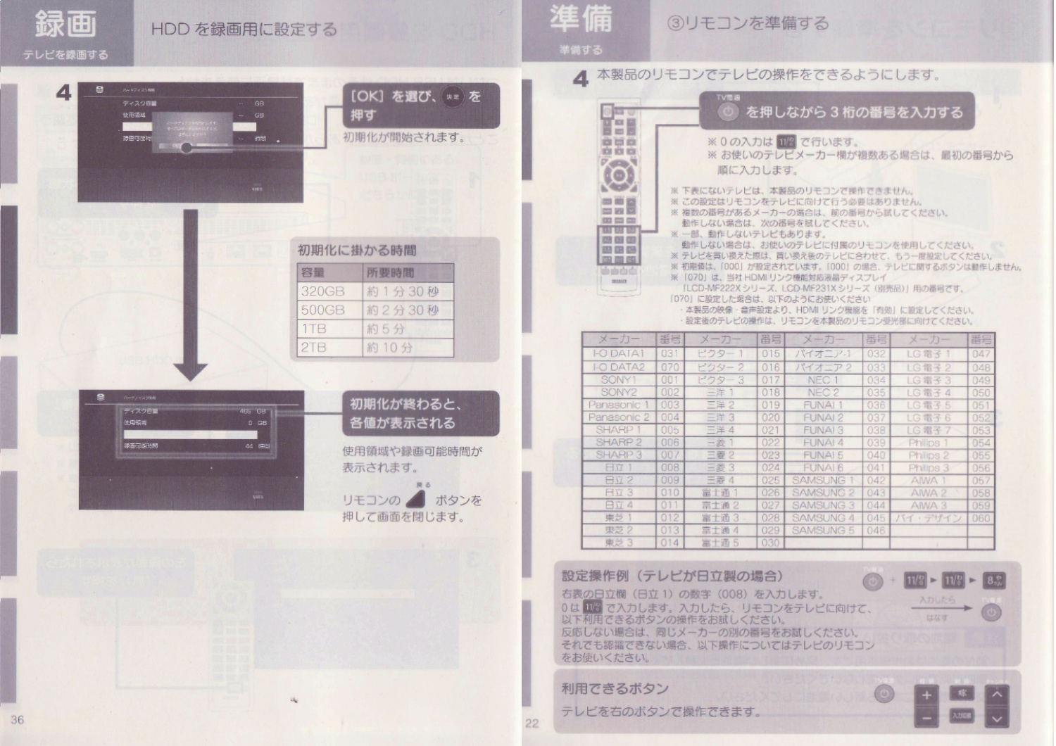 ☆ HDD初期化の方法と時間/TVとのリモコン共有設定(クリック拡大)