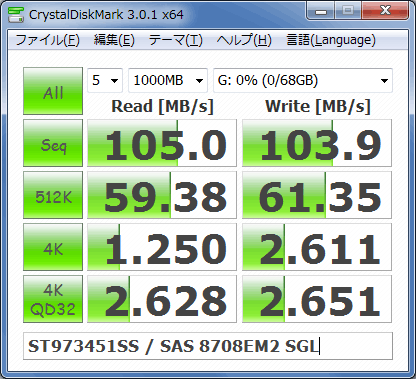 とりあえず1台での速度を計測。まともなRAIDカードを触るのがはじめてなので、もしかしたら設定がおかしいかもしれないが、とりあえずこんな感じ。