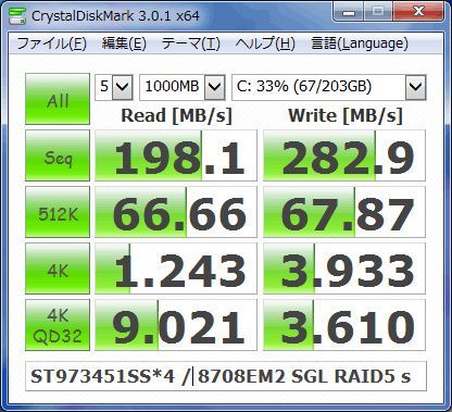 サブマシンがMBE2073RC×4のRAID0構成ですが、SSDと比べるとシーケンシャルは並ぶものの、ランダムは圧倒的敗北。