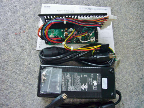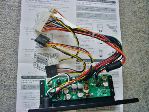 内容物で、上から、取扱説明書、ATX電源設置場所に取り付けるDC/DC基盤、ACアダプタとコンセントを繋ぐケーブル、ACアダプタ、取り付けネジです。