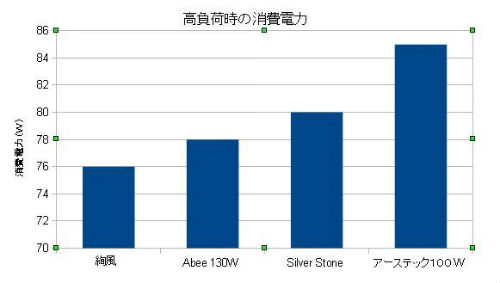 高負荷時の最高消費電力では以外や以外絢風が76Wと一番低く、次点でAbeeのACアダプタが78W、続いて80+の80Wとなりました。