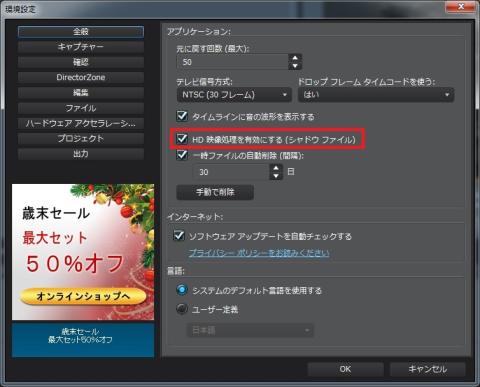 全般⇒HD映像処理を有効にする(シャドウファイル)をチェックつける