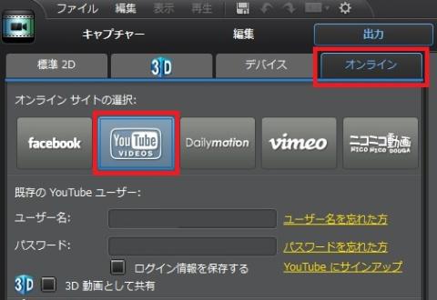 YouTubeに自動アップする場合には、出力方式をオンラインを