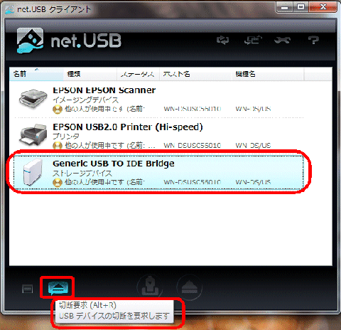 2台目のパソコンでUSBデバイスのHDDにアクセスしたい場合は、接続したいデバイスをクリックし、接続を要求します。