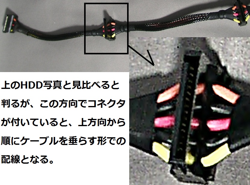 図のほうにも記載したが、この配線だと「HDDの上下が正位置配置」の場合、上から順にケーブルを配線していく形となる。