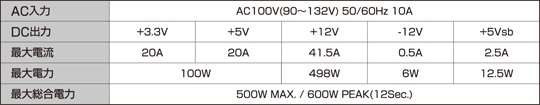 こちらが、80+Platinum認証電源、『KRPW-PT500W/92+』のスペックである。