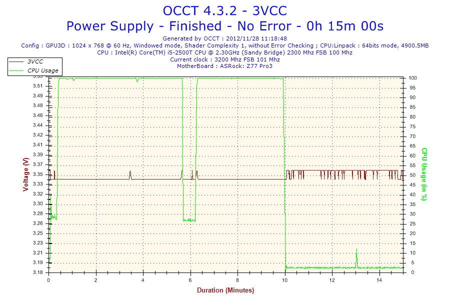 マザーボードがASRock製だと、OCCTでの電圧取得が3.3しかマトモに取れないため、それのみ掲載するが、出力は比較的安定しているようだ。