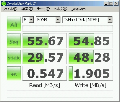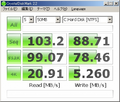 今まで使っていたHDDのCドライブと、現在のSSDのCドライブのベンチマークなるものを取ってみました。