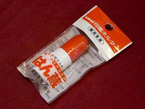 印影が薄くなってきたら専用補充カートリッジだけ交換すれば良いのですが、私は勿体ないので同じUNIから出ている「印鑑ホルダー 補充朱液」なるボトルから朱液を補充しています。