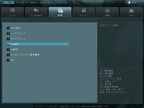 「詳細」の画面です。こちらではオンボードデバイスの設定やSATAの動作設定、ビデオ出力の設定を行います。