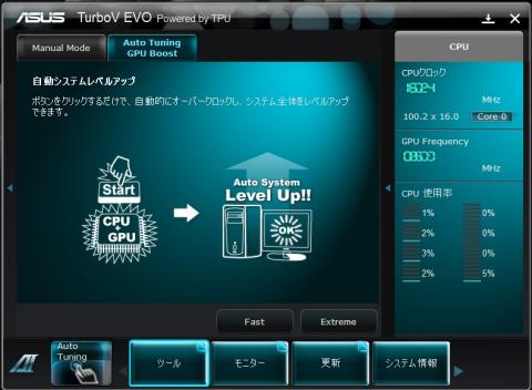 AI Suite Ⅱを起動させ、ツールボタンを押すと一番上に、TURBOV EVOがある。こちらを起動。この「Fast」と「Extreme」というボタンを押せば、自動でオーバークロックしてくれます。「Extreme」はかなりの負荷を掛けるということで、ここは「Fast」を選んでみたいと思います。