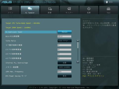 「Ai Tweaker」の画面です。こちらでオーバークロックに関した設定を行います。設定は後ほど。