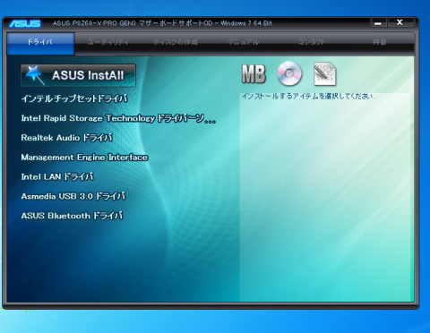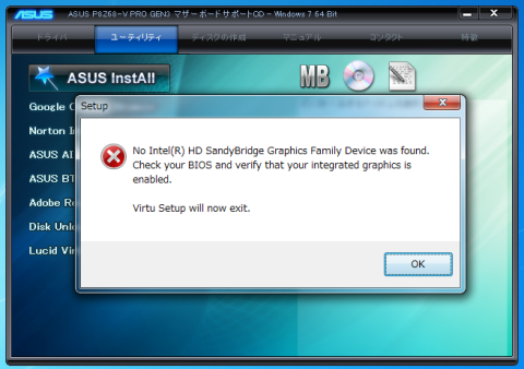 最初にVirtuをサポートDVDをインストールしようとしたら、こんな画面が出ました。