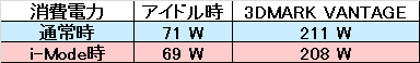 アイドル時と3DMARK VANTAGEのグラフィックテスト1の1つ目のシーン中の最高消費電力の値を計測。